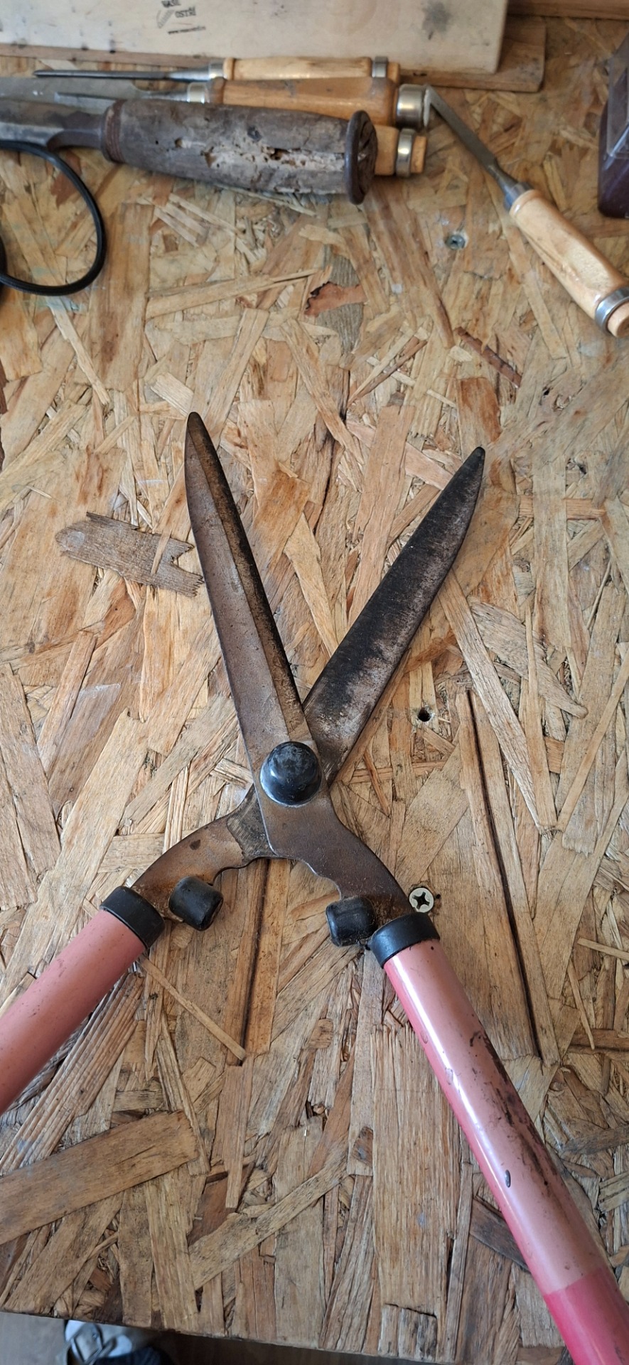 Rozložení, základní čištění, základní broušení brusnými kameny pro odstranění základní rzi a nečistot nastřádaných za léta používání. Drtivá většina těch, kteří používají ruční nářadí (i strojní) po použití nástroj(e) prostě opět položí na místo kde jej vzali. Bez očištění, bez omytí nebo ošetření. Není pak divu, že náčiní takto vypadá. Někdy poměrně velkou roli hraje i to, co daná osoba s náčiním dělá. Například sestříhání okrasných jehličnanů nese nepříjemnou věc a to smůlu-smolu, což je velmi lepkavá a nepříjemná složka, obzvlášť její odstranění, na které pomůže většinou až nějaká chemická látka jako třeba ředidlo. Takže po několika použití můžou být čepele poměrně zanesené, nezřídka u střižných nástrojů v zahradě se pak stává, že špatně pracují i kolikrát vlivem těchto nánosů než skrz toho, že by byl daný nástroj tupý. K základnímu broušení sloužícímu k odstranění těchto nánosů a rzi používám ty nejobyčejnější brusné kameny volně dostupné v kterémkoli železářství. Jedná se v podstatě o základní brousky na sekery, nože nebo kosy. Většinou jsou 2 vrstvé , potřebují být před použitím aspoň na 5 minut namočeny, aby nasály vodu. Broušení je pak hladší a pohodlnější. Stačí běžné základní zrnitosti kolem 180-240 pro hrubé broušení, pak 320-400-600 pro jemnější a konečné pak provedeme v zrnitosti 1000-1500, i 1000 zrnitost je dostatečná pro tvorbu kvalitního ostří. Při hrubosti nad 2000 jde již spíš o započaté finišování jako je leštění a velmi velmi jemné broušení zejména u speciálních nožířských ocelí pro vytvoření extrémně ostrého ostří, jaké známe u špičkových kuchařských nožů apod. Tohle ostří je však pro náš účel zbytečné ba dokonce nevhodné. U takto extrémního ostří, je fazeta a samotné ostří "vytaženo" do až vlásečnicového - žiletkového ostří, které není fyzicky schopno ustát prováděné práce na zahradně, včetně například nožů do sekaček. Takže ostré ostří ano, ale v přijatelném úhlu a síle materiálu. Přece jen, s těmito nůžkami jdeme stříhat stromy a keře. I když pouze drobné větvičky, ale přesto dřevo. Takže doporučený úhel v rozsahu 22 - 30° na stranu. Jen pro porovnání, například hlavně japonské nože se svou unikátní ostrostí mají tohle ostří kolem cca 10° na stranu. Při základním broušení styčných ploch fazet, se vám určitě stane, že prostřední část dané plochy bude oproti okrajům stále jako by "neobroušená", to je v pořádku, Používáním, výrobou se běžně stane (obzvlášť u levnějších nástrojů) že je vnitřní broušená část již používáním "ošolichaná" nebo od výroby "nerovná". Nás však hlavně zajímá začátek této plochy tam, kde se střetává na vrcholu s ostřím protější strany. pokud vám nevzhledný střed esteticky vadí, je jednodušší jej přebrousit v ruce klasickým smirkovým papírem (hrubost cca 400), protože i když se jedná o nerovnost v řádu tisícin milimetrů, její celotělové dobroušení může stát poměrně spoustu úsilí a přitom k dosažení cíle není podstatná a jedná se pouze o estetickou záležitost. Ať už zvolíte jakoukoli formu, je třeba zvýšené opatrnosti při36 broušení, aby nedošlo k podbroušení, nebo poškození samotného pracovního ostří o které nám jde ! Pro naše účely skončíme zrnitostí 1000, kde již na hraně ostří cítíme GROT. Pokud máme takto nabroušeny obě části nůžek, zbývá poslední krok. Nabroušení samotného ostří čepele z venkovní strany. Ostří nůžek má 2 brusy. 1 brus je samotné ostří a 2 brus větší je pro snížení profilu čepele k daným účelům. Kdyby se brus č.2 vynechal, byl by úkos příliš hrubý a vyžadoval by obzvlášť velkou sílu pro stříhání. Proto je čepel takto zbroušena. Výhodou však je, že krom estetického vyčištění není třeba s tímto pomocným ostřím cokoli dělat. Pro nás je důležité ostří č.1 - pracovní. Pokud to jde, je doporučený původní úhel broušení výrobce, tady cca 22-24°. Samozřejmě si můžete vybrousit i úhel svůj, je však dobré zvážit pro a proti :-) Ojehlení - obtažení ostří po broušení. Máte dvě možnosti. Před složením nůžek obtáhnete ostří o kůži, každou část samostatně. Nebo nůžky složíte a naprázdno opakovaně sevřete - otevřete - takto se ojehlují po broušení klasické nůžky na papír. Když máte složeno, je vhodné broušené části včetně spoje ošetřit olejem a seřídit dotažení čepelí k sobě šroubem. Každé nůžky mají jít volně otevírat i zavírat, bet drhnutí, bez větší síly. Ať se daří :-)